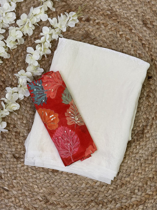 White Semi Kathan Silk Saree with Work Blouse Combo