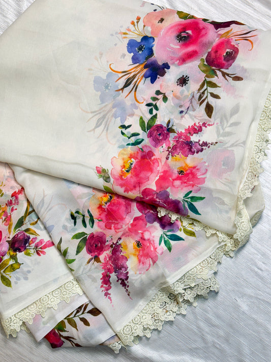 White with Pink Floral Embroidered Pure Mul Cotton Saree with Sleeveless Blouse Combo