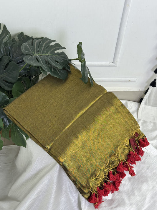 Golden Caramel Red Tassel Plain Khadi Tissue Saree