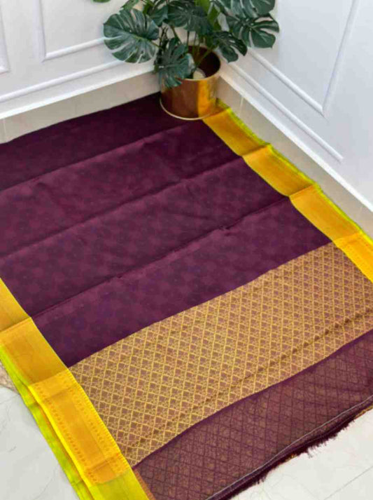 Meroon & Greenish Yellow Kora Muslin Saree