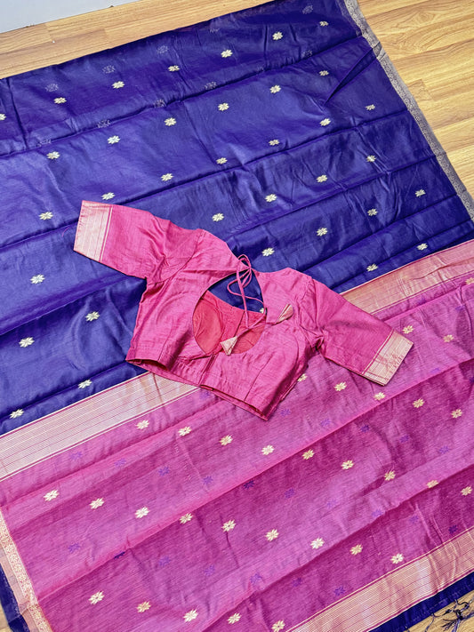 Blue with Maroon Khadi Cotton Sarees with Sleeveless Blouse Combo