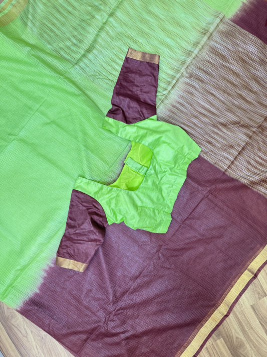 Green with Magenta Kota Cotton Saree with Stitched Blouse Combo