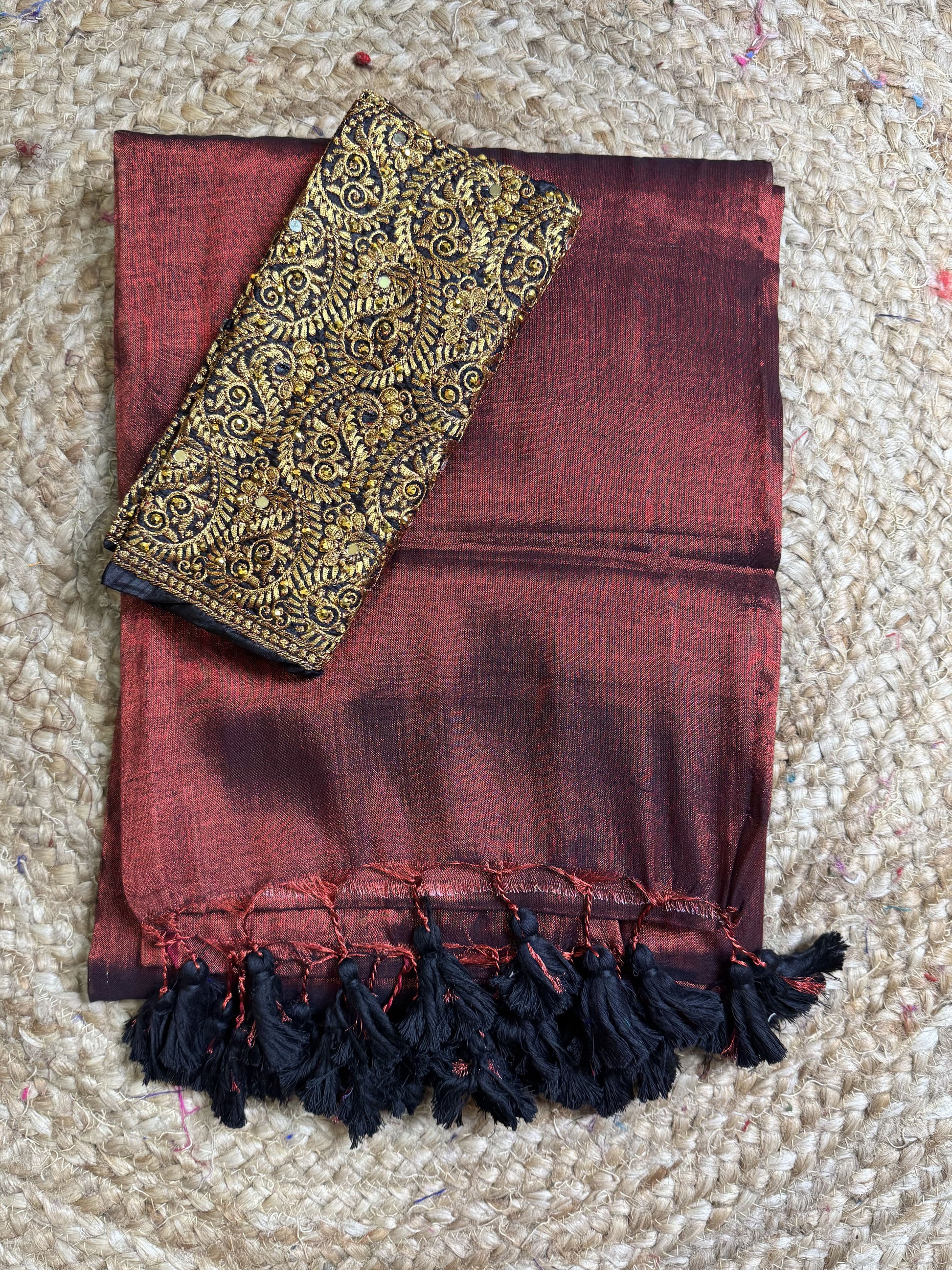 Maroon with Black Tassel Plain Tissue Saree with Work Blouse