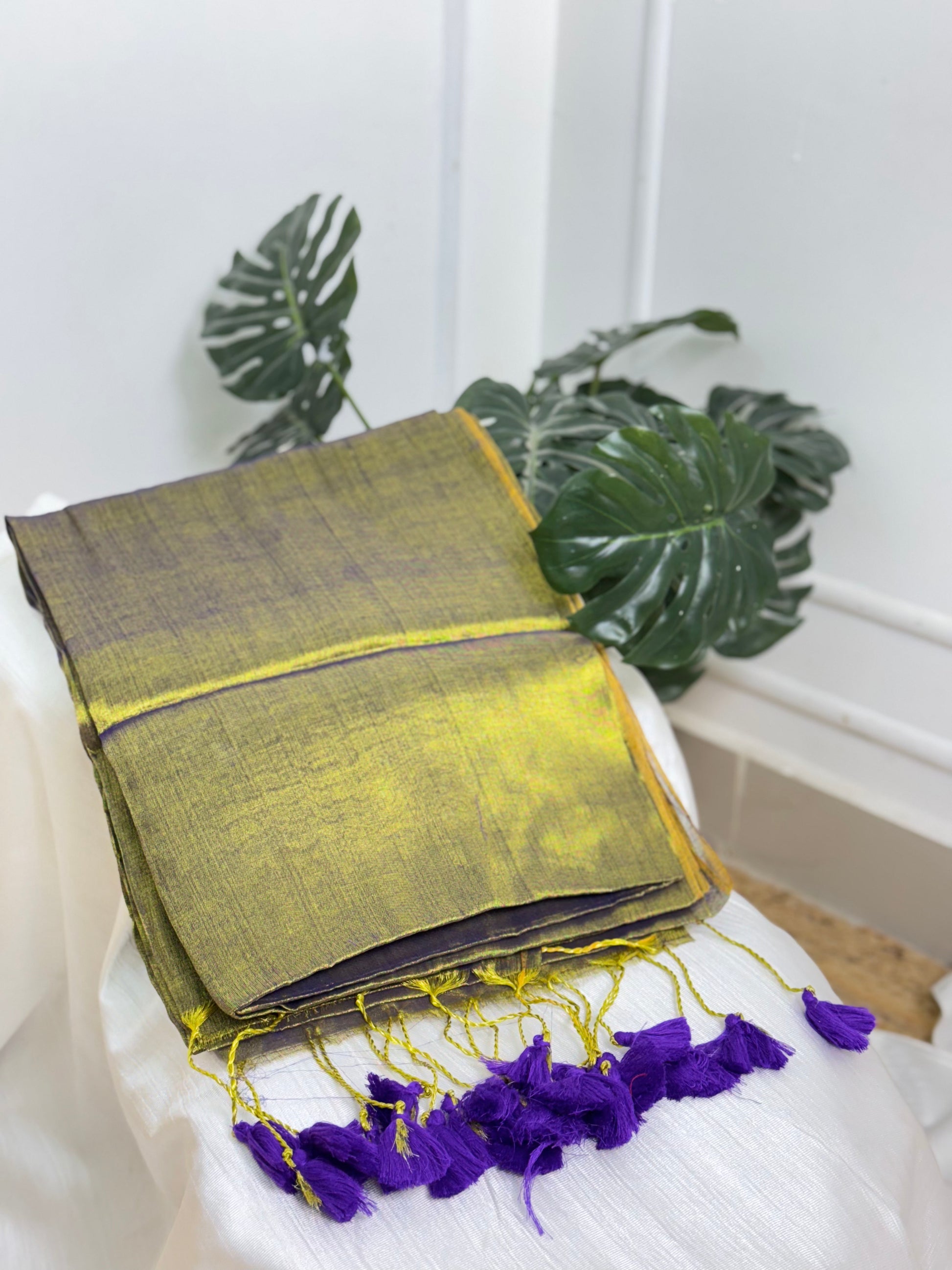 Golden Lavender Violet Tassels Plain Tissue Saree