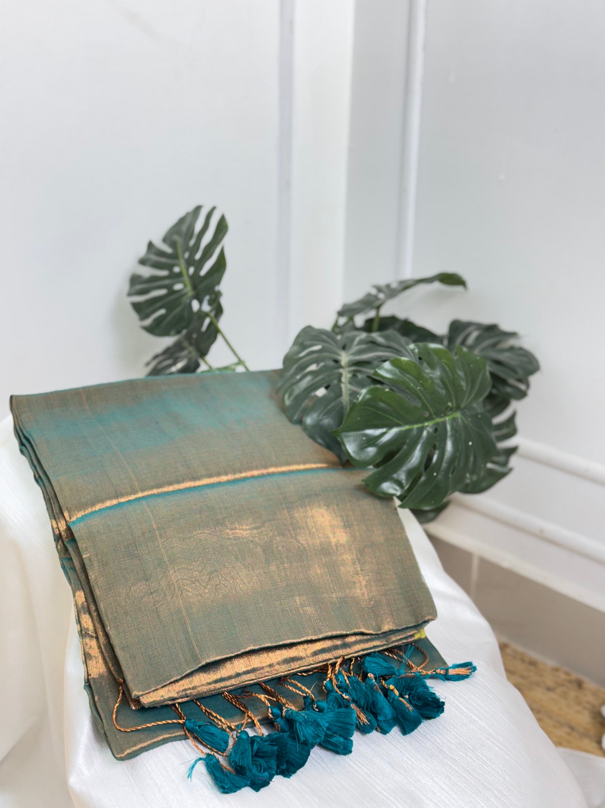 - Plain Tissue Fabric - Has Golden Zari details - Saree has a Matching Unstitched Blouse piece Note: Product color may slightly vary due to photographic lighting sources or your monitor settings.