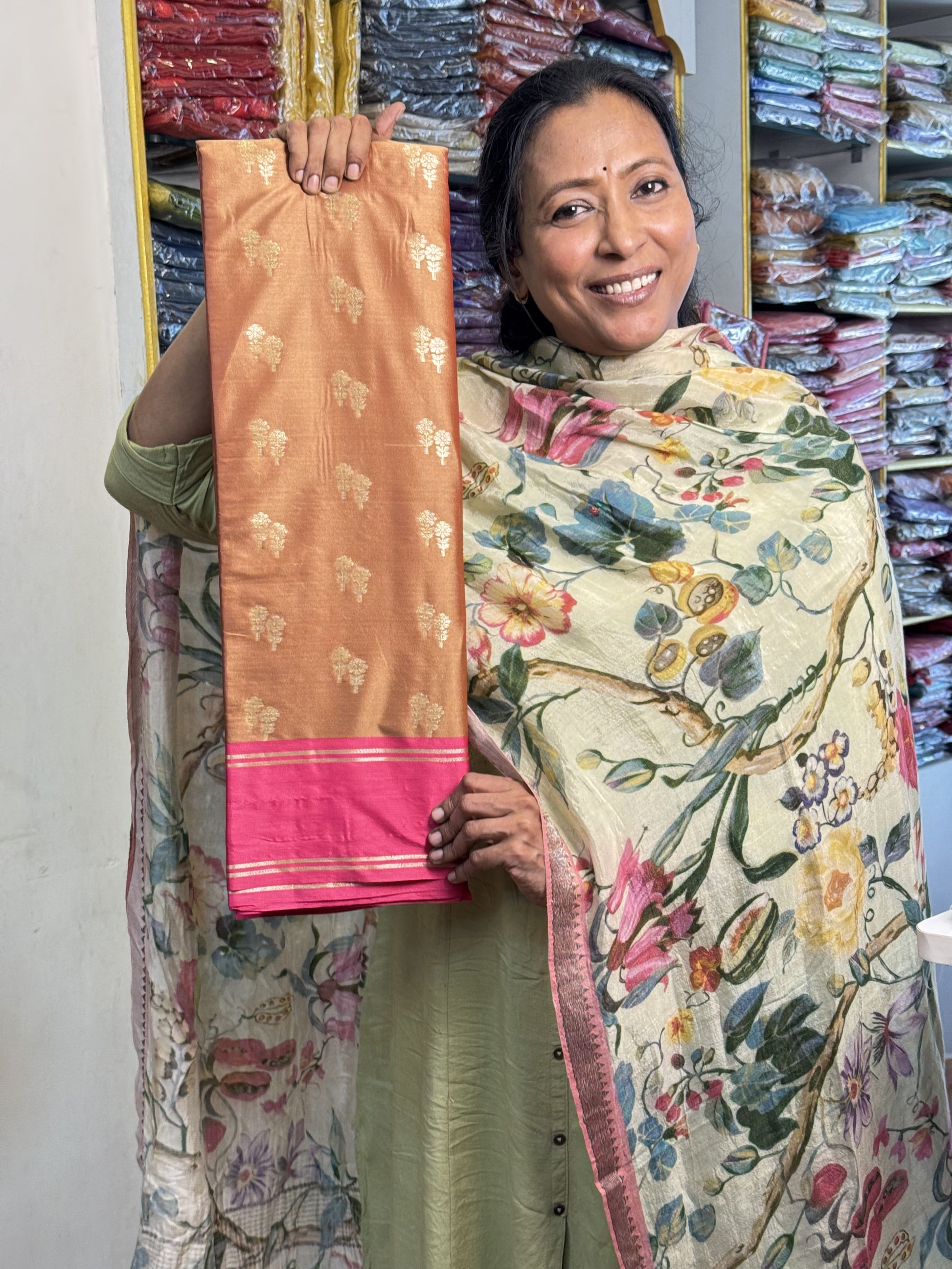 -Soft Silk Saree Fabric - Has Golden Zari details - Saree has a Matching Unstitched Blouse piece Note: Product color may slightly vary due to photographic lighting sources or your monitor settings.
