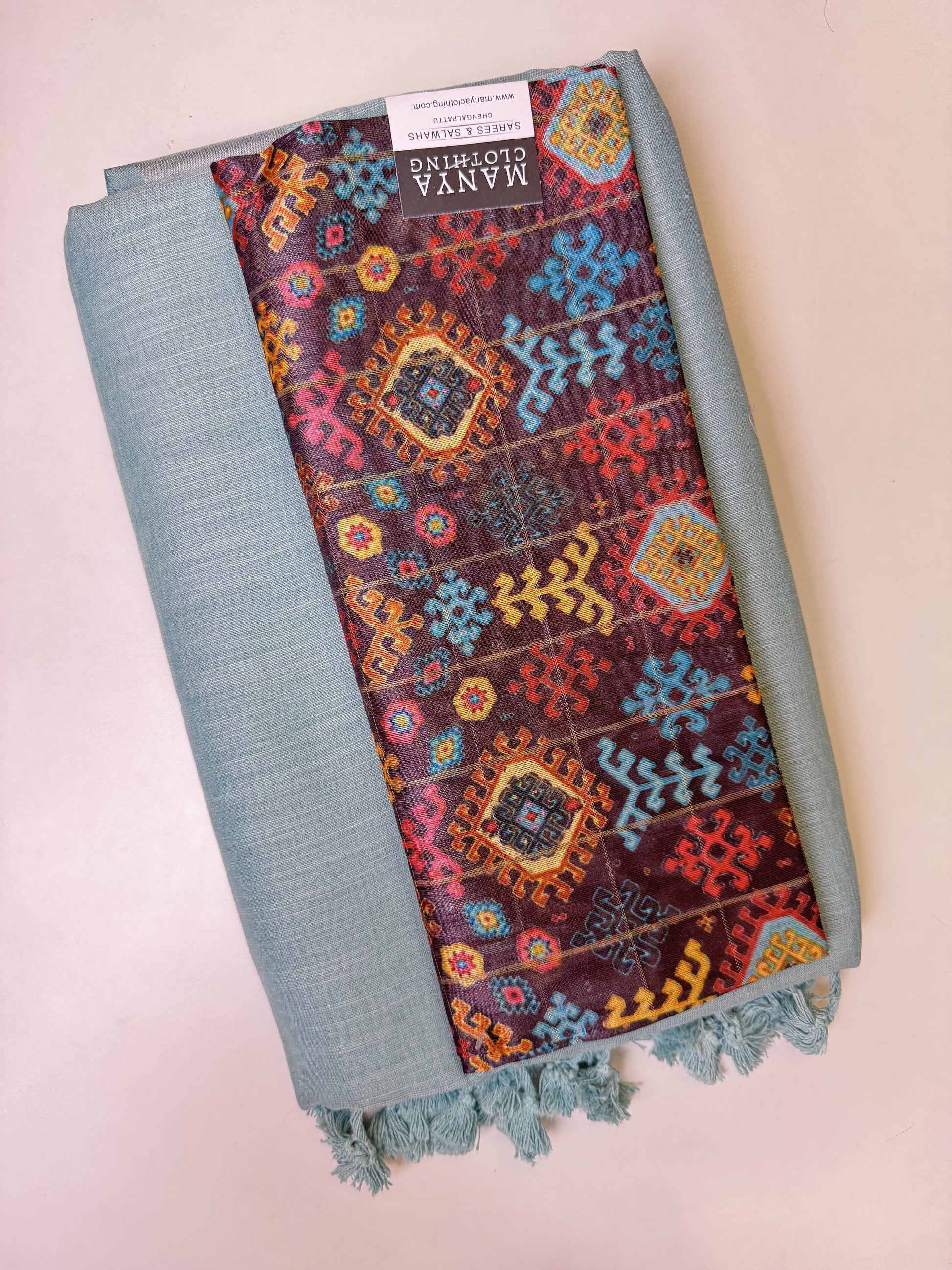 - Cotton Saree with Silver Zari Border and Contrast Blouse
