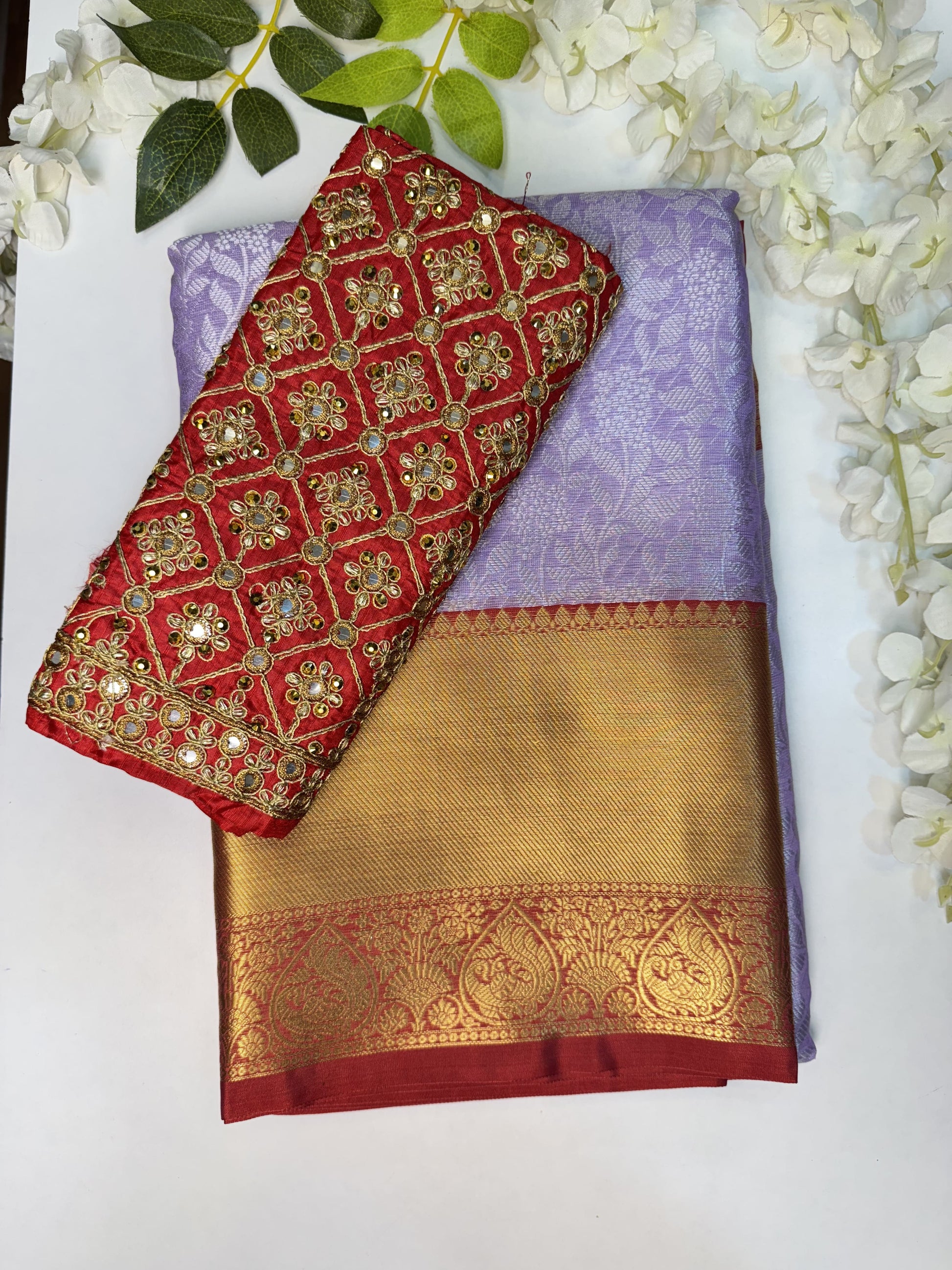 Lavendar with Red Semi Kathan Saree with Work Blouse Combo
