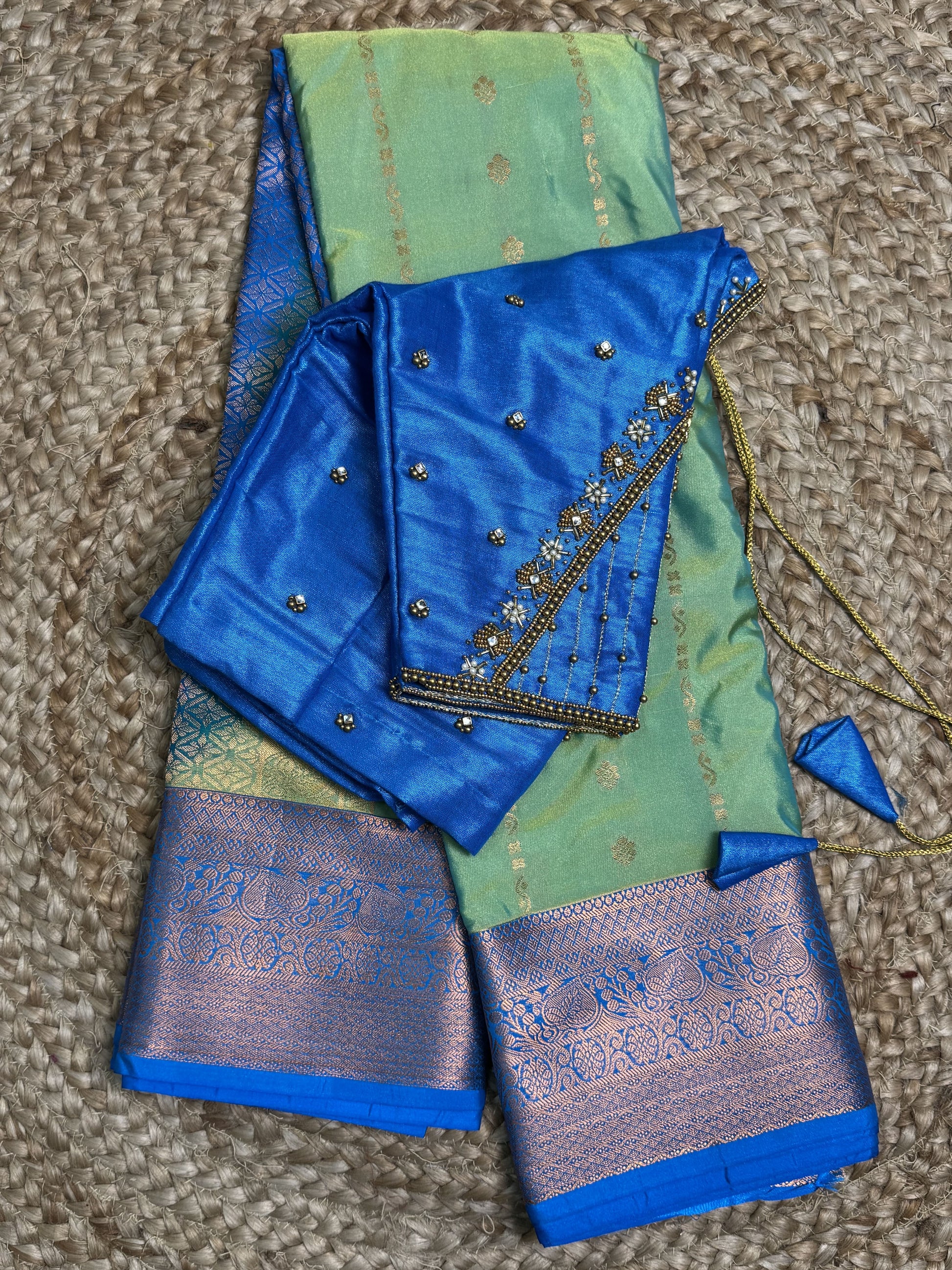 Green with Blue Semi Silk Saree With Hand Work Blouse Combo