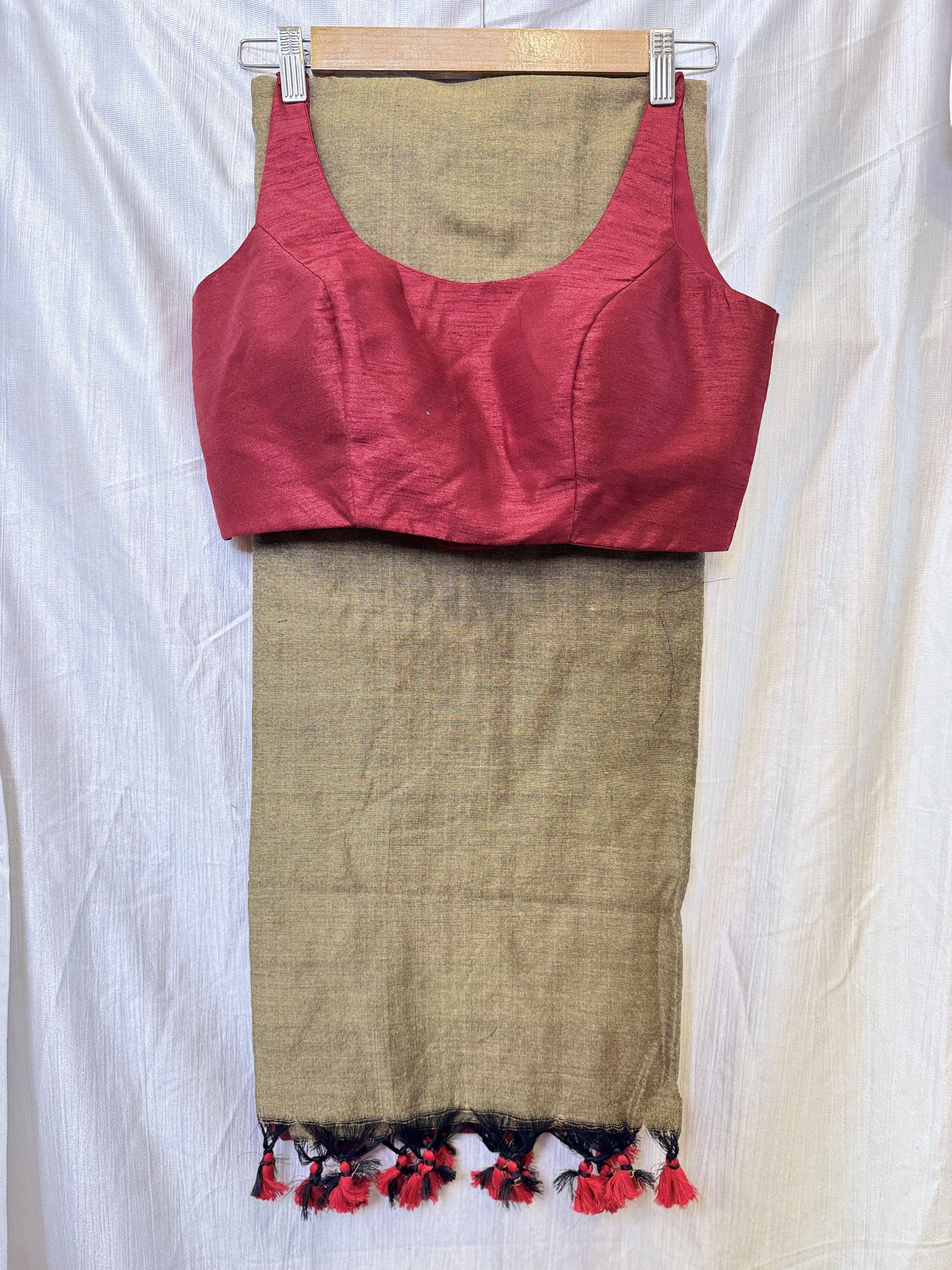 Olive Green with Maroon Khadi Cotton Sarees with Sleeveless Blouse Combo