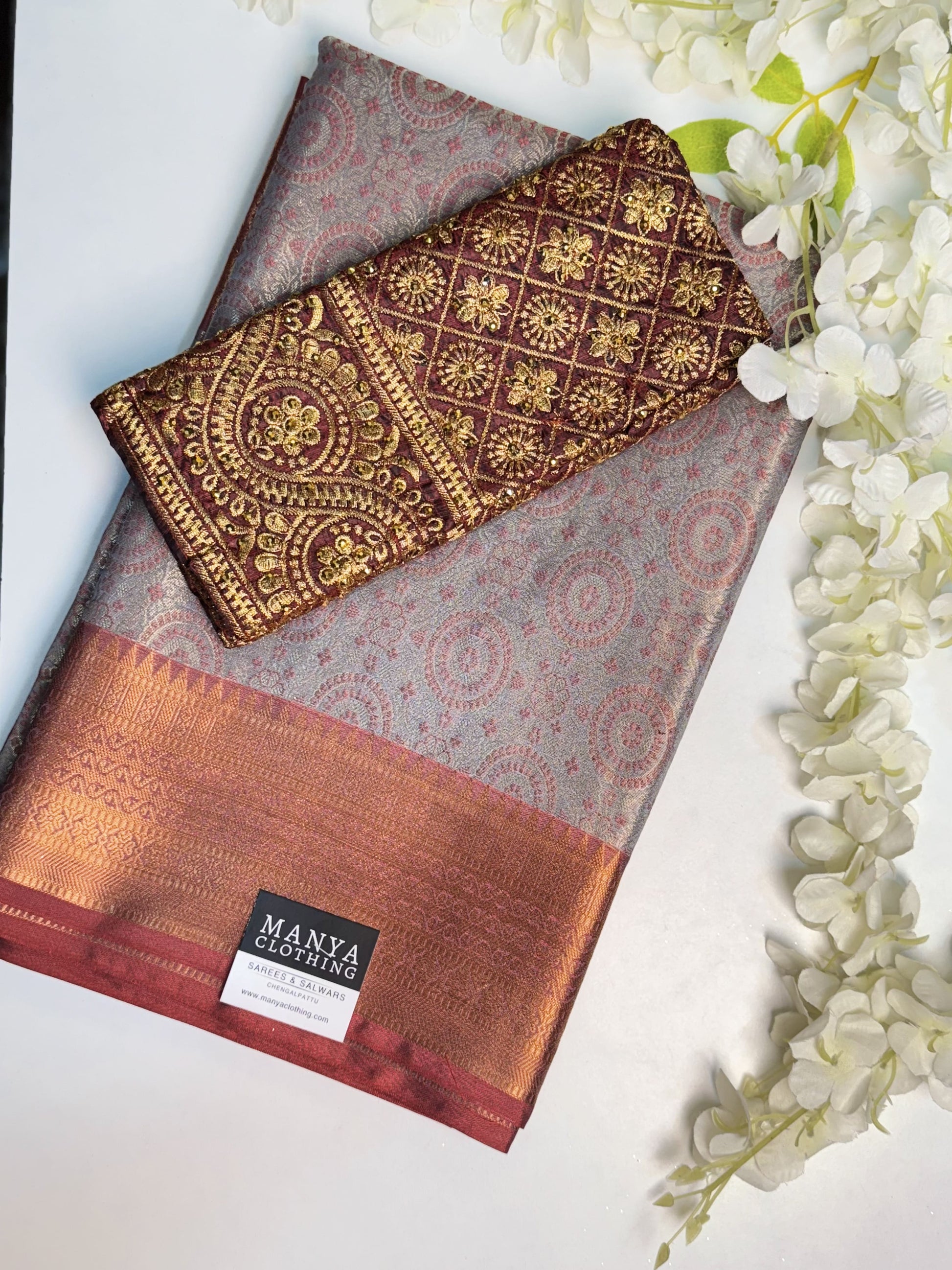 Silver-Grey Semi Kathan Saree with Work blouse combo