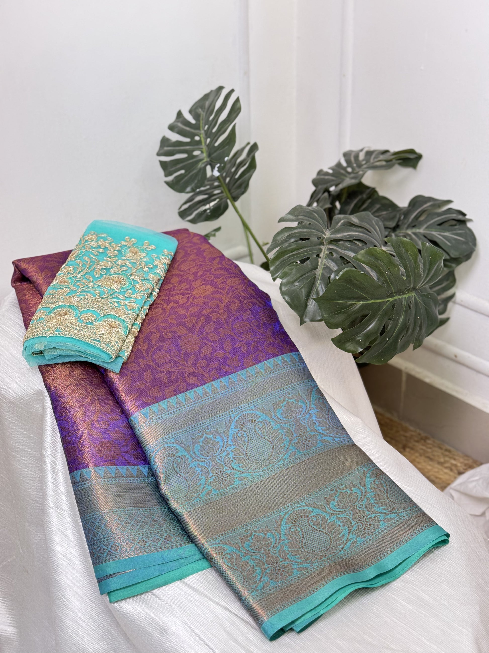 Purple RamaGreen Semi Kathan Saree With Work Blouse Combo.