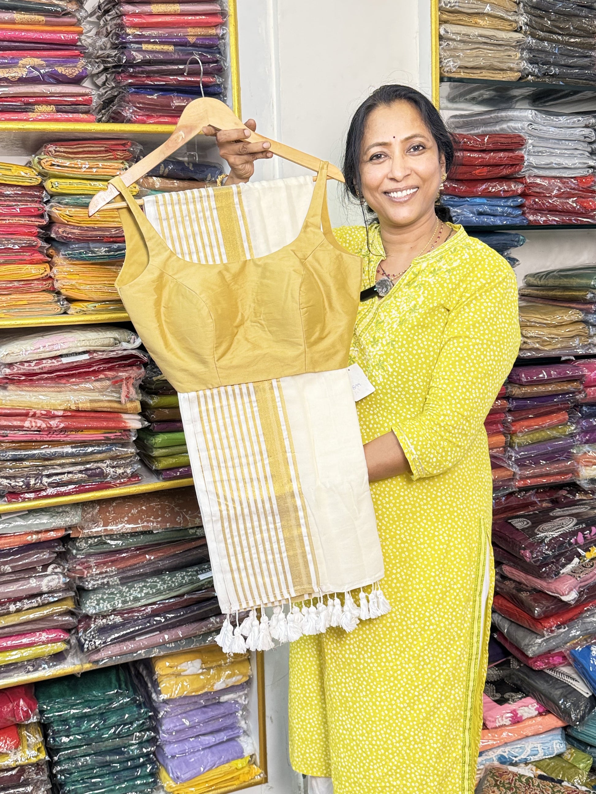 White with Gold Pure Mul Cotton Saree with Sleeveless Blouse Combo