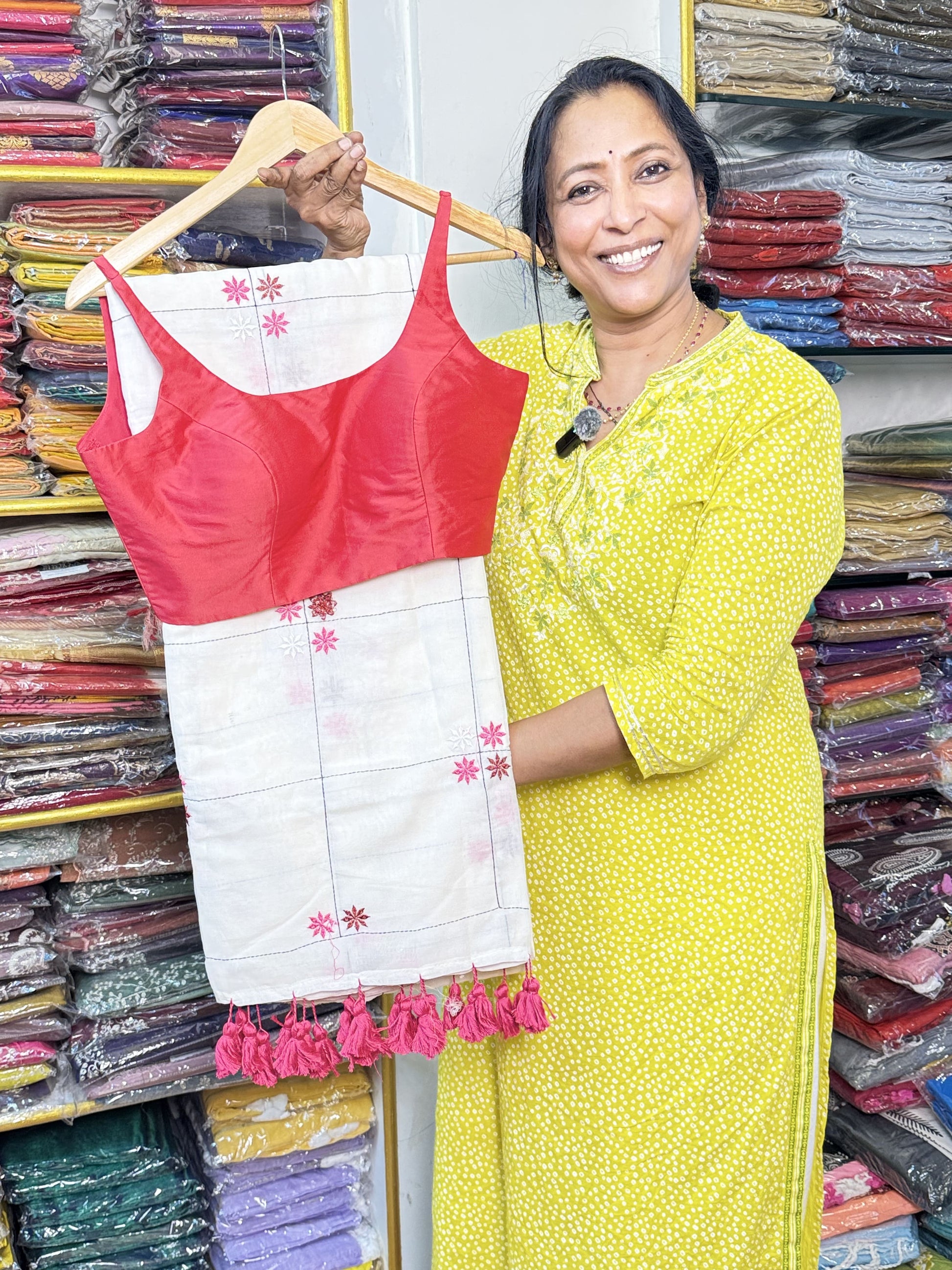 White with Pink Floral Embroidered Pure Mul Cotton Saree with Sleeveless Blouse Combo