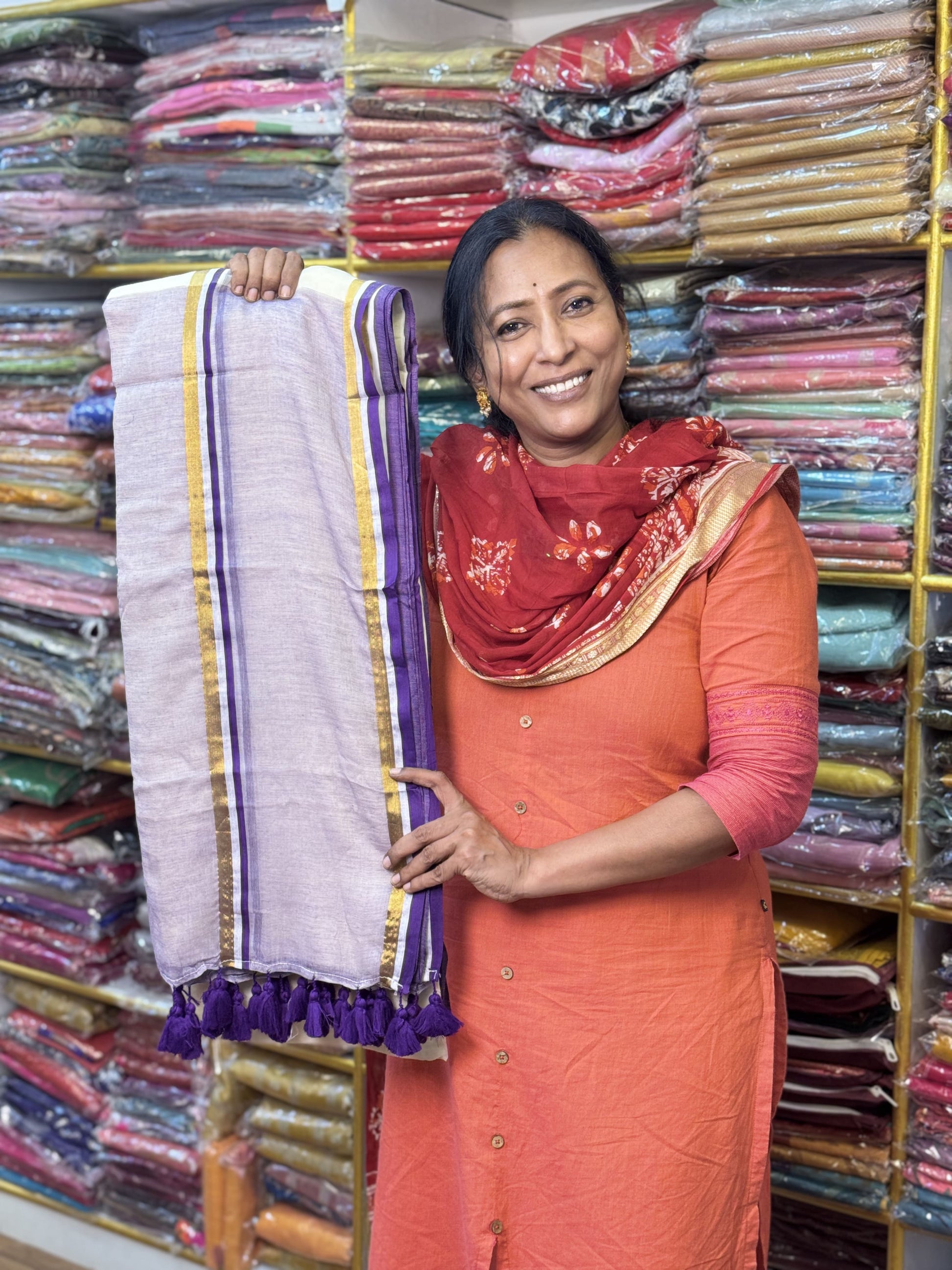 White with Violet Border & Pallu Pure Mul Cotton Saree